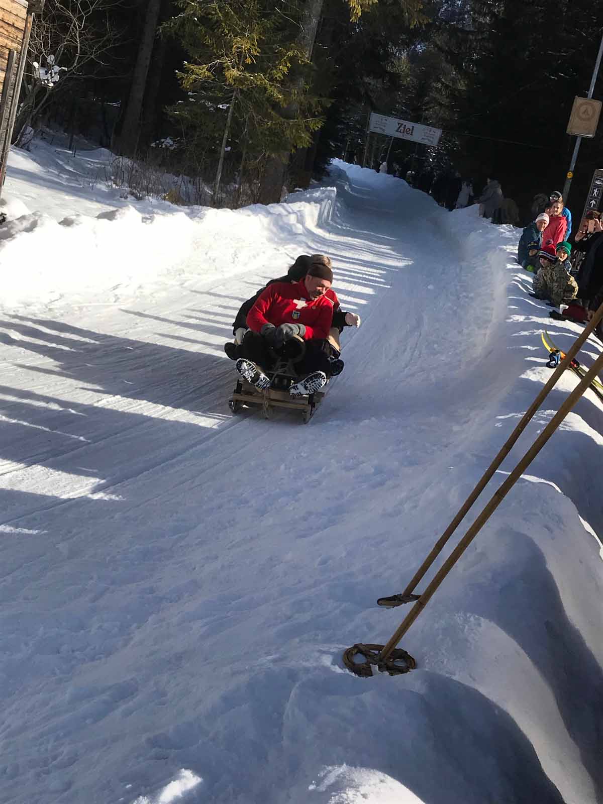 Weiter geht es bei -wieder sonnigem- Winterwetter zum nostalgischen Schlittenrennen auf der Rodelbahn. Was heißt Rennen – dieses Mal kann man selber mitfahren. Augenscheinlich haben sowohl Schlittenführer als auch Passagiere Spaß daran. Eigentlich wäre ich auch gerne mitgefahren, aus Angst, dass Rock und Unterkleid die Fahrt nicht überstehen, lasse ich es bleiben. Nächstes Mal muß dann noch ein sportliches Nostalgie-Outfit mit!