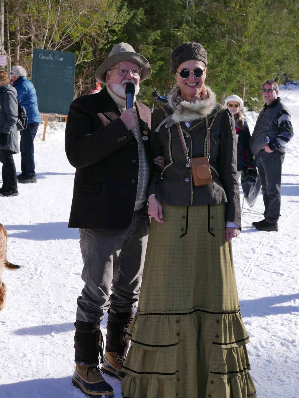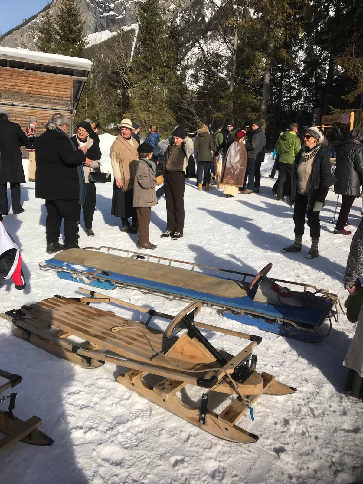 Und da sind wir auch schon bei meinen persönlichen Highlights der Woche, die gleichfalls von den Bewohnern und Gästen getragen werden: die historischen Wintersport-Vorführungen! Der ersten Vorführung wohnen wir Freitagnachmittag während eines historischen Spaziergangs bei: dem nostalgischen Abfahrtsrennen. Herrlich ist schon, zu beobachten, wie die Skiläufer in ihren nostalgischen Outfits den Hang zum Start hinaufstapfen.