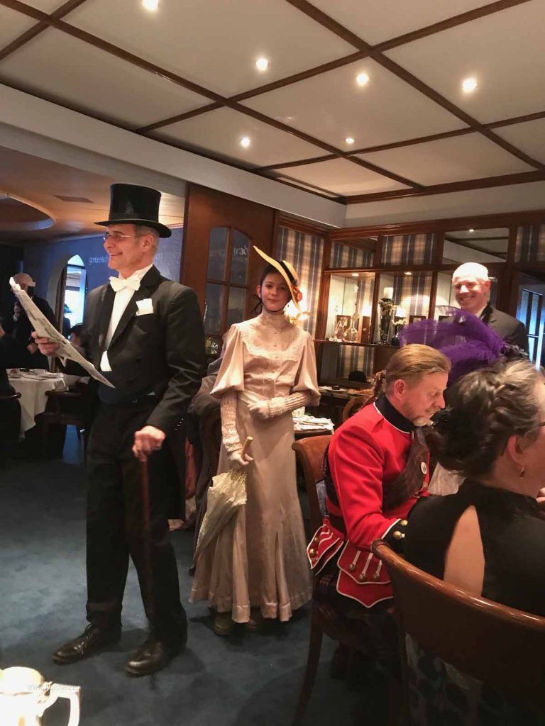 Danach bleibt gerade noch Zeit zum Umziehen und schon geht es weiter – zum Belle Epoque Ball, der zum Glück direkt im Hotel Victoria stattfindet, in dem wir übernachten. Zunächst trifft man sich im Vestibül. Es gibt es Schalen mit Champagner und Canapés – stilecht!