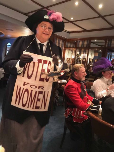 Wir verschnaufen kurz im Hotel und machen uns dann gleich auf dem Weg zum High Tea mit Modenschau im Waldhotel Dolder. Mehrere Gastsäle sind bis auf den letzten Platz besetzt und die „Models“ flanieren durch die Säle – auch die umrahmenden Epochen werden mit Kleidern vorgeführt. Sehr lustig ist ein überfallartiger Auftritt der Sufragetten während der Show: mit Wahlplakaten und Ansteckern für die Männer „Vote for women“, die von ihnen persönlich angebracht werden.