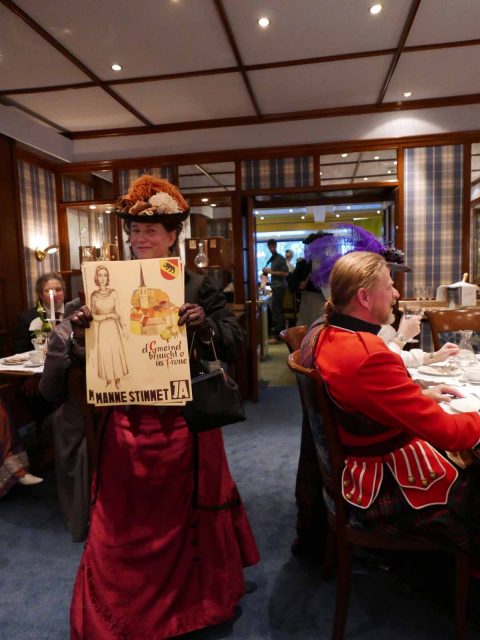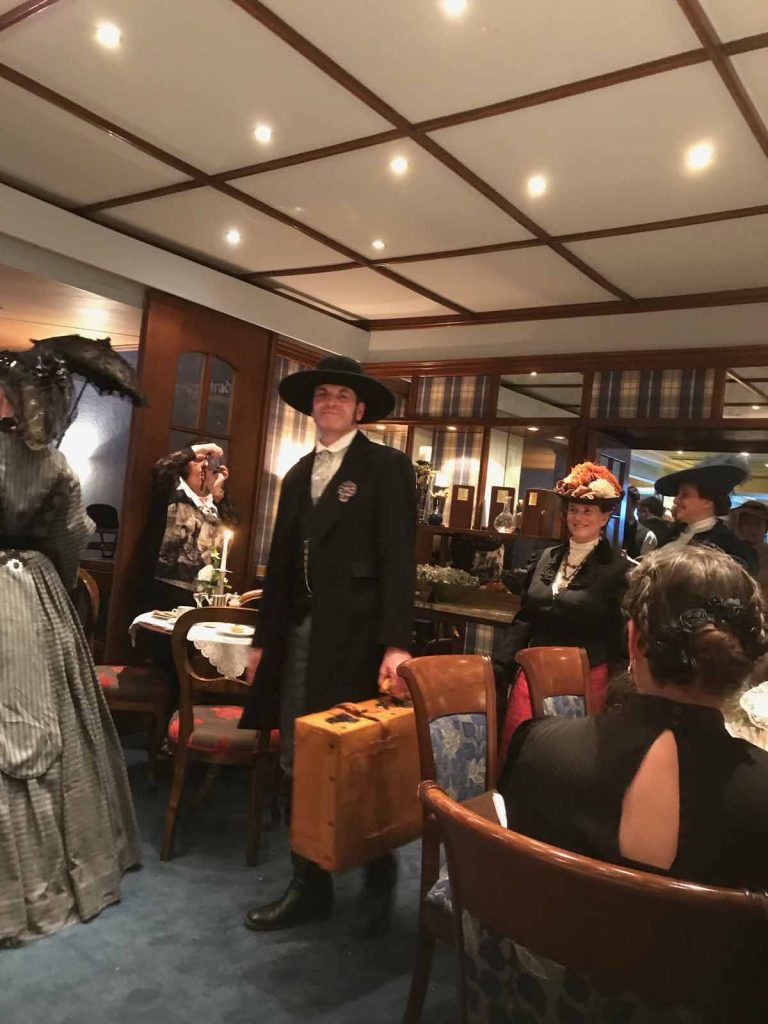 Neben mir sitzt Barbara – die Tanzmeisterin. Barbara kennt sich mit historischen Tänzen aus – in ihrer eigenen Tanzschule Tanzsalon gibt sie auch Kurse – ihre Lieblingstänze aus dieser Zeit sind Walzer , Polka und -für mich überraschend: Tango. Sie erzählt, Tango wurde in Europa schon ab 1905 getanzt! Historische Touren-Tänze, die damals beliebt waren, wie die Quadrille, bei denen mehrere Tänzer zusammen richtige Figuren tanzen (ähnlich wie dem heute bekannteren Square Dance) sind aufwändiger zu lernen und heute -sogar bei den Fans der Belle Epoque- nicht mehr so gefragt.