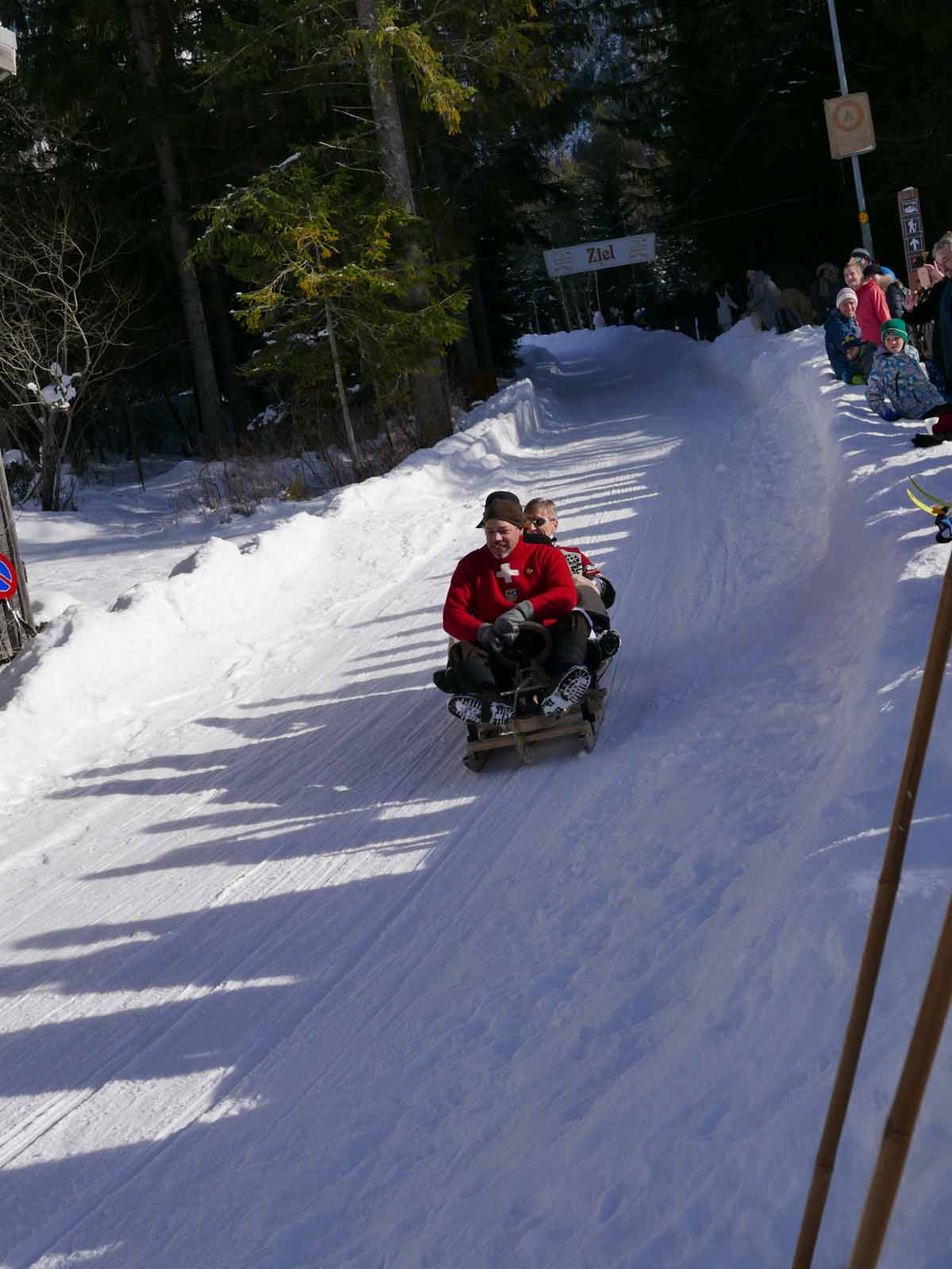 Und wenn sie dann mit Karacho durch’s Ziel laufen, sieht man die Kostüme noch viel besser. Ich bin großer Fan der Outfits – es sieht einfach toll aus, die Stoffhosen, Lederschuhe und dicken Pullis und die alten Holzski mit Stöcken erst! Bewundernswert auch die Kinder und Frauen jeder Altersklasse die am Start sind -letztere in langen Röcken! Insgesamt ein herrliches Spektakel bei sonnigem Winterwetter. Und last but not least ist auch der Pistenmann stilecht, der mit Tute das Startsignal für die Läufer gibt und dann die Zeit klassisch mit Stoppuhr nimmt…
